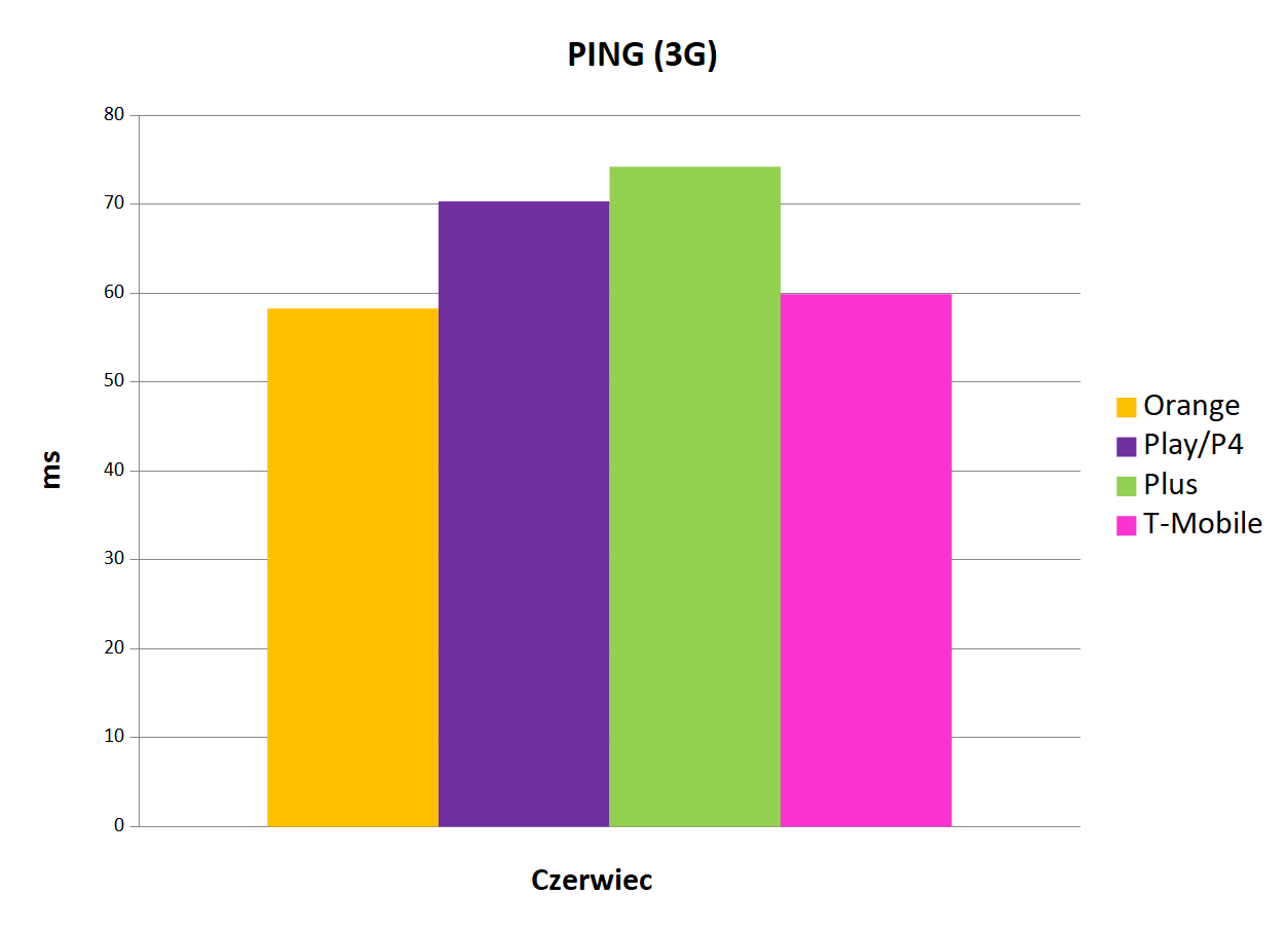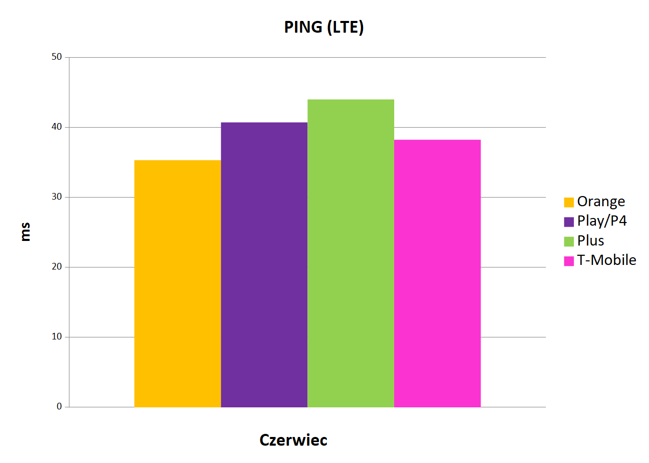 Czołowa pozycja w kategorii najniższej wartości ping należała do Orange, które poprawiło swój wynik i może pochwalić się wynikiem 35,31 ms. Pomarańczowemu Operatorowi nieodłącznie towarzyszy T-Mobile, który osiągnął wynik 38,23 ms. Po raz kolejny na trzeciej pozycji uplasował się Play (40,7 ms), a czwartym operatorem w Polsce pod tym względem był Plus (43,99 ms).
