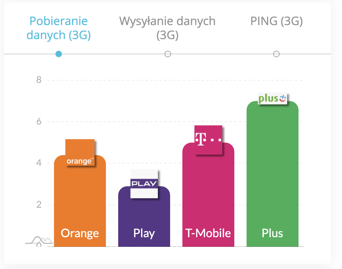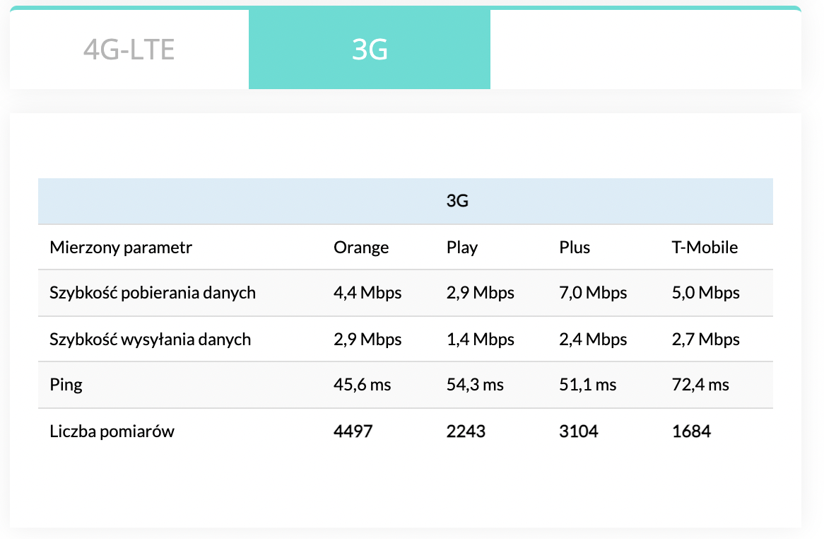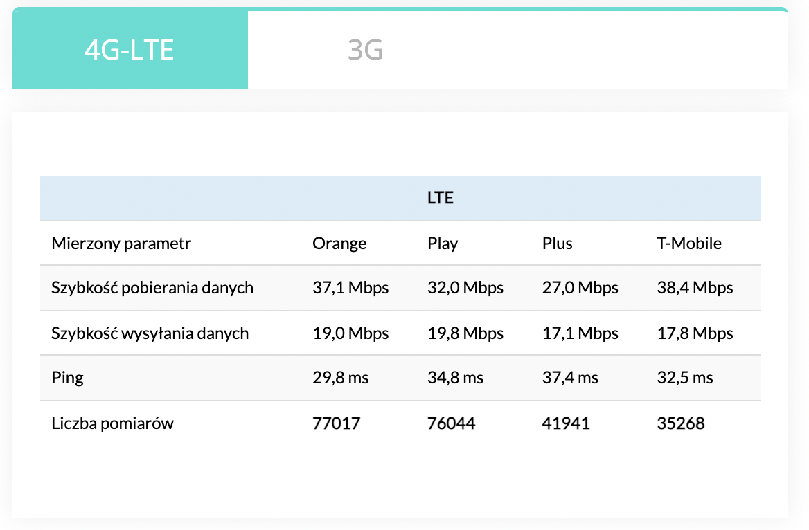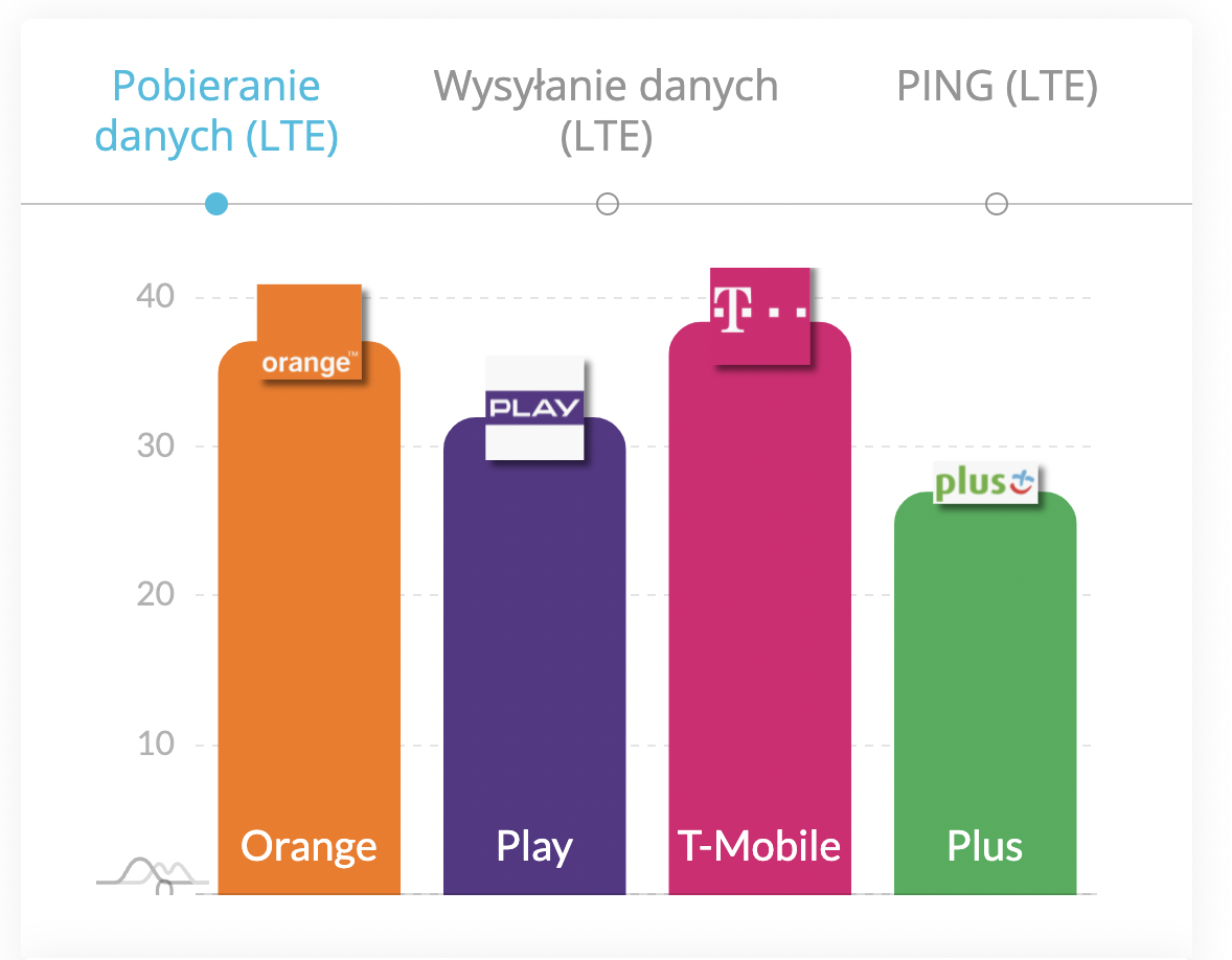 Za plecami Play znalazło się Orange (19 Mb/s), które walczy zawzięcie o powrót na najwyższe miejsce w zestawieniu. Na trzecim miejscu znalazł się T-Mobile (17,8 Mb/s), a tabele zamknął Plus (17,1 Mb/s).