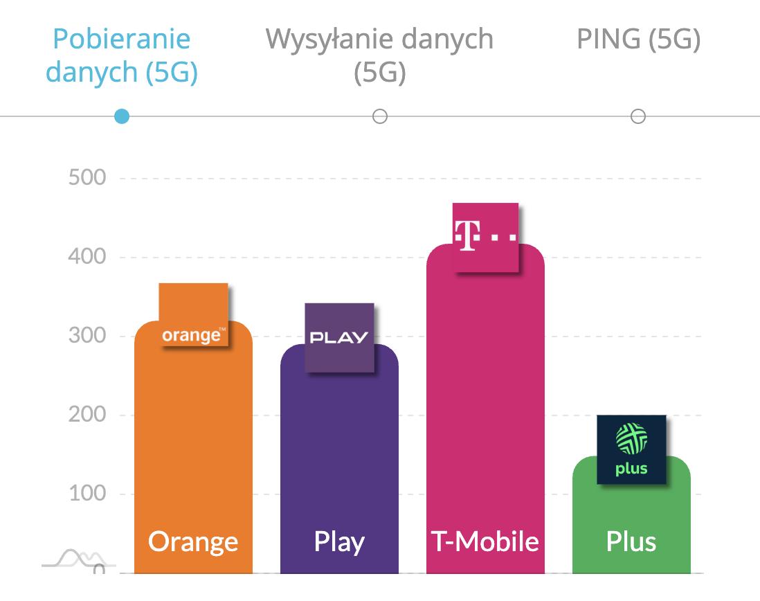 T-Mobile osiągnął najwyższe wartości dla pobierania danych – 417,5 Mb/s, co stawia go na pozycji lidera pod względem szybkości działania usług. Za nim uplasowały się Orange (319,9 Mb/s), Play (290,6 Mb/s) oraz Plus (148,7 Mb/s).