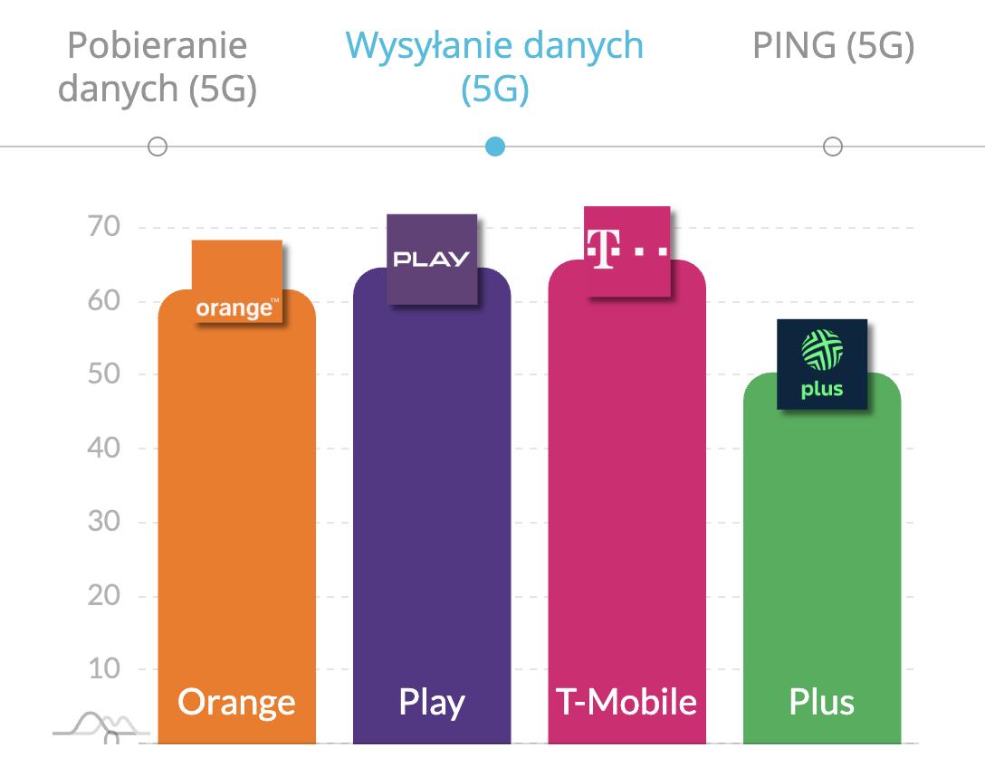 W zakresie wysyłania danych przez aplikacje również najlepszy wynik osiągnął T-Mobile (65,7 Mb/s), nieznacznie wyprzedzając Play (64,6 Mb/s) i Orange (61,7 Mb/s). Plus zakończył stawkę z wynikiem 50,4 Mb/s.