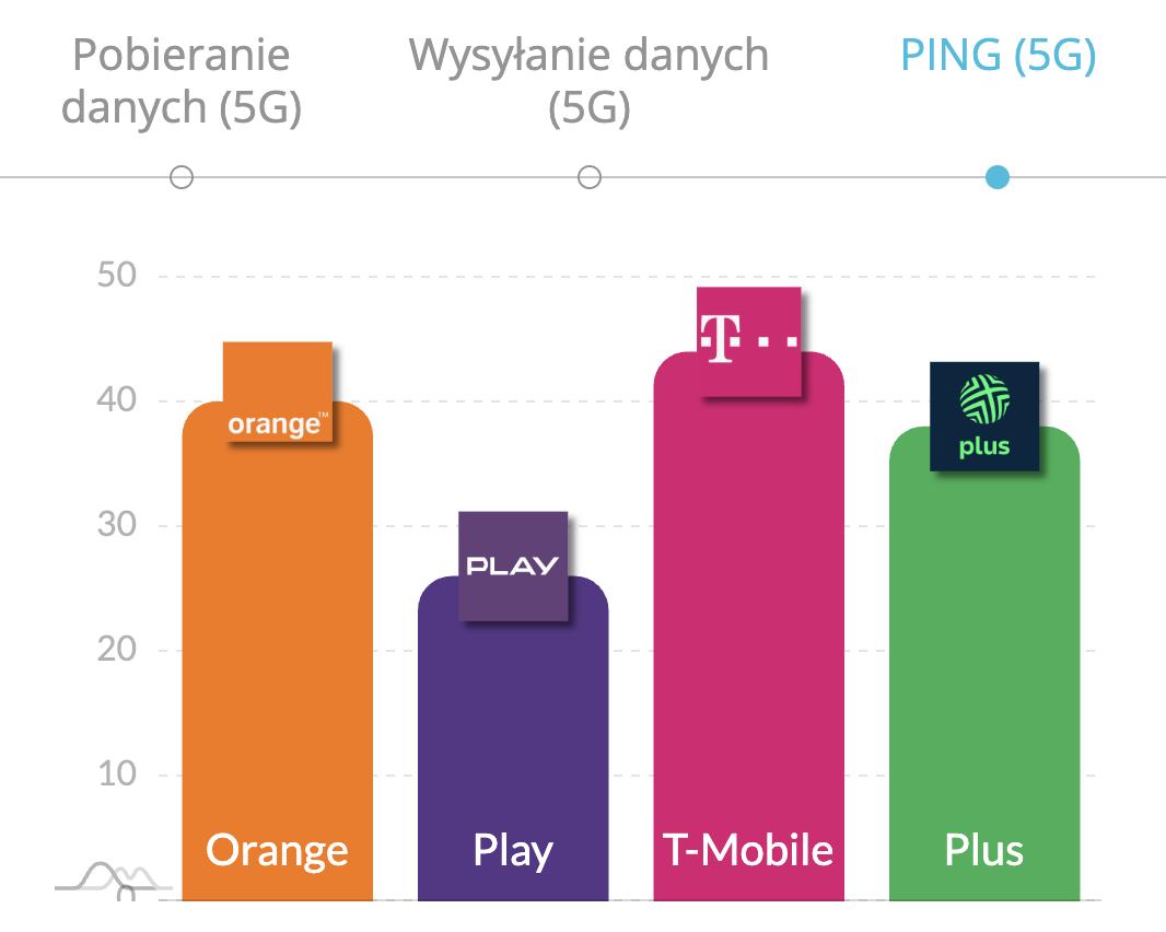 Najlepszy wynik osiągnął Play, uzyskując średnie opóźnienie na poziomie 26 ms, co świadczy o bardzo szybkim czasie reakcji sieci. Kolejne miejsca zajęły Plus (38 ms) i Orange (40 ms), natomiast T-Mobile uzyskał najwyższe opóźnienie spośród analizowanych operatorów – 44 ms.