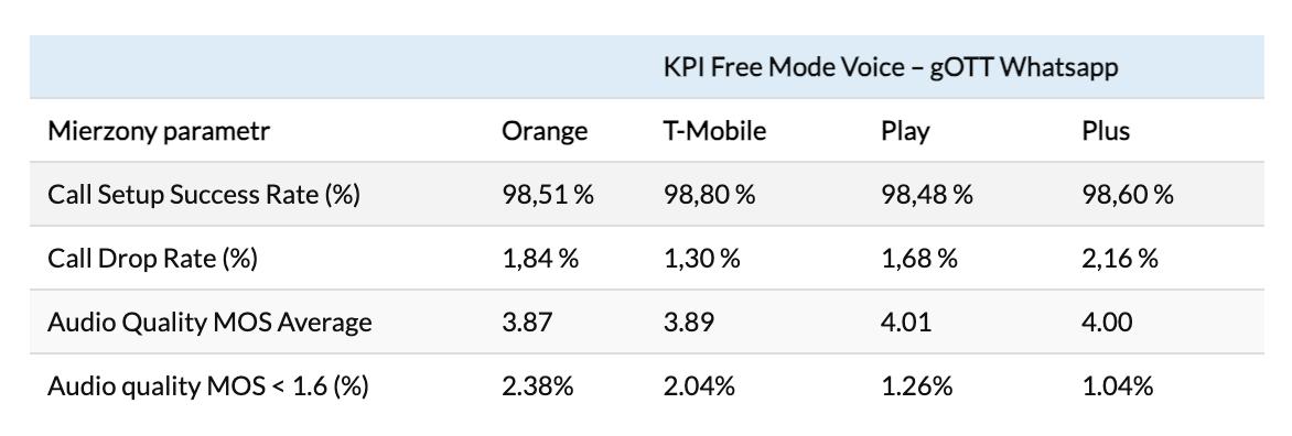 W teście jakości połączeń głosowych realizowanych przez aplikację WhatsApp najlepszy ogólny rezultat osiągnęły sieci Play i Plus, które uzyskały najwyższe średnie oceny jakości dźwięku (MOS) – odpowiednio 4,01 i 4,00. Co więcej, Plus wyróżnił się najniższym odsetkiem połączeń o bardzo słabej jakości (MOS < 1.6) – zaledwie 1,04%, co świadczy o stabilnej jakości usług OTT w tej sieci.