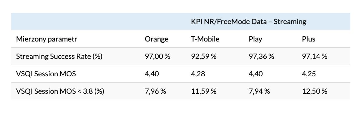W teście KPI NR/FreeMode Data – Streaming 4K (STATIC), który ocenia jakość odtwarzania wideo w rozdzielczości 4K, najwyższy wskaźnik sukcesu odnotował Play (97,36%), tuż przed Plus (97,14%) i Orange (97,00%). Najsłabiej wypadł T-Mobile, z wynikiem 92,59%, co może świadczyć o większych problemach z płynnością odtwarzania wideo w tej sieci.