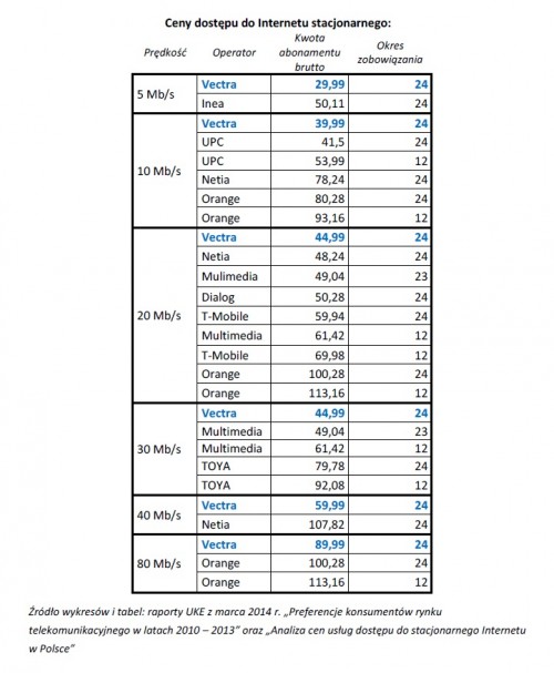 krajowych operatorów. Zgodnie z raportem UKE, Vectra ma najkorzystniejsze ceny za Internet w najpopularniejszych wśród internautów prędkościach 5, 10, 20, 30, 40 i 80 Megabitów na sekundę. Jednocześnie operator testuje łącza światłowodowe doprowadzone do końcowego odbiorcy o przepływności do 10 Gigabitów na sekundę.