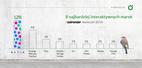 Według najnowszego raportu SoTrender, Netia ma największy odsetek zaangażowanych fanów (12%) wśród marek telekomunikacyjnych oraz drugi najwyższy wskaźnik Relative Interactivity.