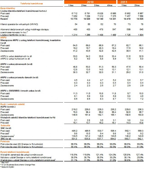 Na koniec czerwca 2011 roku liczba klientów Orange wyniosła 14,5 mln, co oznacza wzrost rok do roku o 3,6% w porównaniu ze średnim wzrostem całego rynku, który jest szacowany na ok. 6,4%. Dynamika wzrostu bazy klientów stanowi osiągnięcie w kontekście aktywności nowych, agresywnych operatorów głównie P4 (operator PLAY) – który korzysta z asymetrii w zakresie stawek MTR, ale także MVNO.