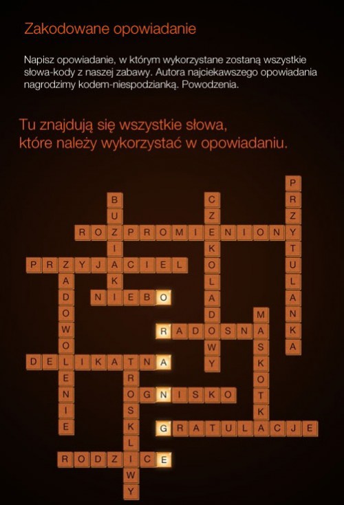 Zakodowane opowiadanie – Orange zorganizował konkurs w ramach, którego w zamian za opowiadanie, w którym wykorzystane zostaną wszystkie słowa-kody z zabawy, Operator przewidział kod z niespodzianką.