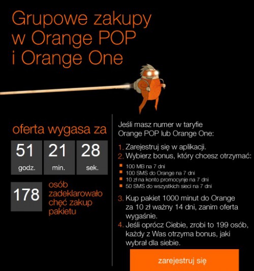 Wracają grupowe zakupy w Orange na kartę: jeżeli do 23:00 w środę zbierzecie przynajmniej 200 osób, które zarejestrują się w aplikacji i kupią pakiet 600 SMS-ów, Orange odda każdej z nich 6 złotych na konto promocyjne. Natomiast co setny nabywca pakietu otrzyma aż 25 zł.