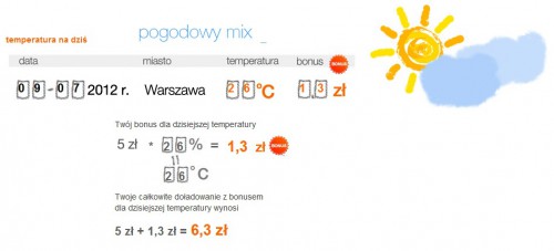 Bonus uzależniony jest od panującej w danym dniu temperatury, mierzonej w Warszawie o godzinie 12:00, wartość Bonusu to wartość wyrażona w złotówkach obliczana na podstawie wzoru: