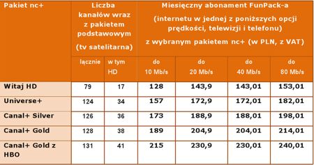 Oferta pakietów nc+ dla klientów Orange Polska to ponad 100 kanałów tematycznych, m.in filmowych, sportowych, dziecięcych, rozrywkowych czy popularno-naukowych, a także jeszcze więcej niż dotychczas kanałów nadawanych w jakości HD. W nowych pakietach klienci otrzymują dostęp do 41 kanałów HD, w tym wielu kanałów oferowanych w telewizji satelitarnej na wyłączność, tylko na platformie nc+.