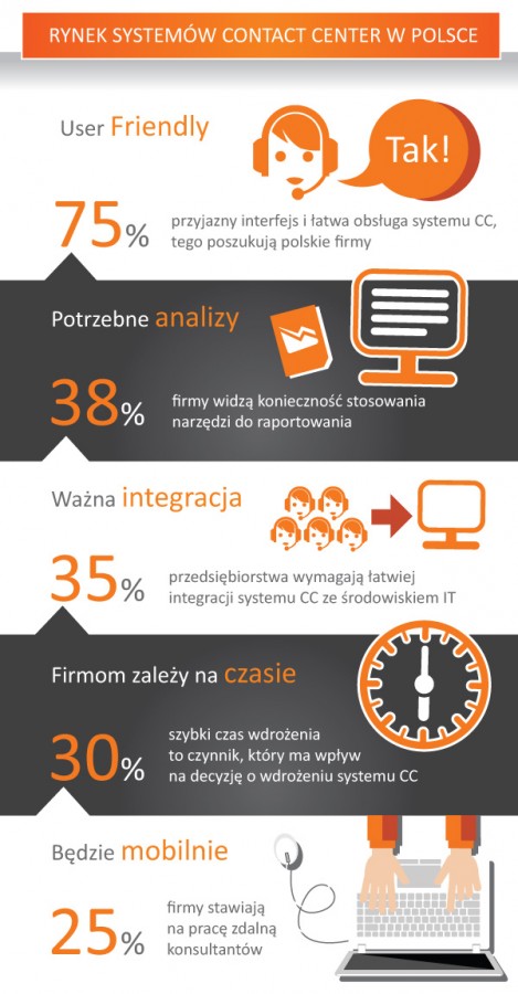 Integrated Solutions (IS), wyspecjalizowany integrator ICT należący do Orange Polska, zrealizował badanie* dotyczące potrzeb polskich przedsiębiorstw w zakresie systemów Contact Center. Łatwa integracja ze środowiskiem IT firmy (35 proc.) i szybki czas wdrożenia (30 proc.), to dwa czynniki, na które firmy zwracają szczególną uwagę, decydując się na wdrożenie systemu CC. Z kolei organizacje, które już posiadają rozwiązania do zarządzania centrum obsługi klienta oprócz kwestii integracji, za priorytetowe uznają także ergonomiczny interfejs systemu (75 proc.) oraz obecność funkcji do raportowania (38 proc.).