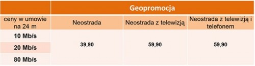 Mieszkańcy 76 gmin, w których decyzją UKE zderegulowano rynek szerokopasmowego internetu, otrzymują kolejną możliwość wyboru oferty internetowej najlepiej dopasowanej do ich potrzeb. Prócz promocji obowiązujących na terenie całego kraju, czyli Internetu Tu i Tam, oferującego w jednym pakiecie Neostradę z internetem mobilnym lub Neostrady z gadżetami do wyboru, mogą teraz skorzystać także z tzw. Geopromocji, czyli niższych cen Neostrady wprowadzonych na zderegulowanych obszarach.