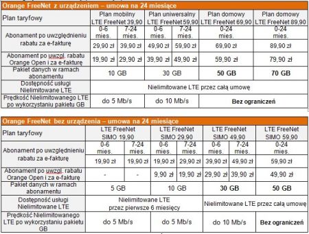 Od 27 kwietnia będą dostępne nowe plany internetowe, opracowane z myślą o różnych potrzebach klientów. W nowych planach Orange LTE FreeNet do wyboru są trzy proste i kompletne propozycje ofert, których wspólną cechą są bardzo duże pakiety na transmisję danych oraz nielimitowany dostęp do sieci LTE. Już za 19,90 zł miesięcznie, klienci mogą swobodnie korzystać z internetu LTE nie ograniczając się pakietem GB. W ramach oferty dostępne są routery mobilne, domowe oraz tablety w cenie od 0 zł na start oraz nowe plany abonamentowe w opcji bez urządzenia.