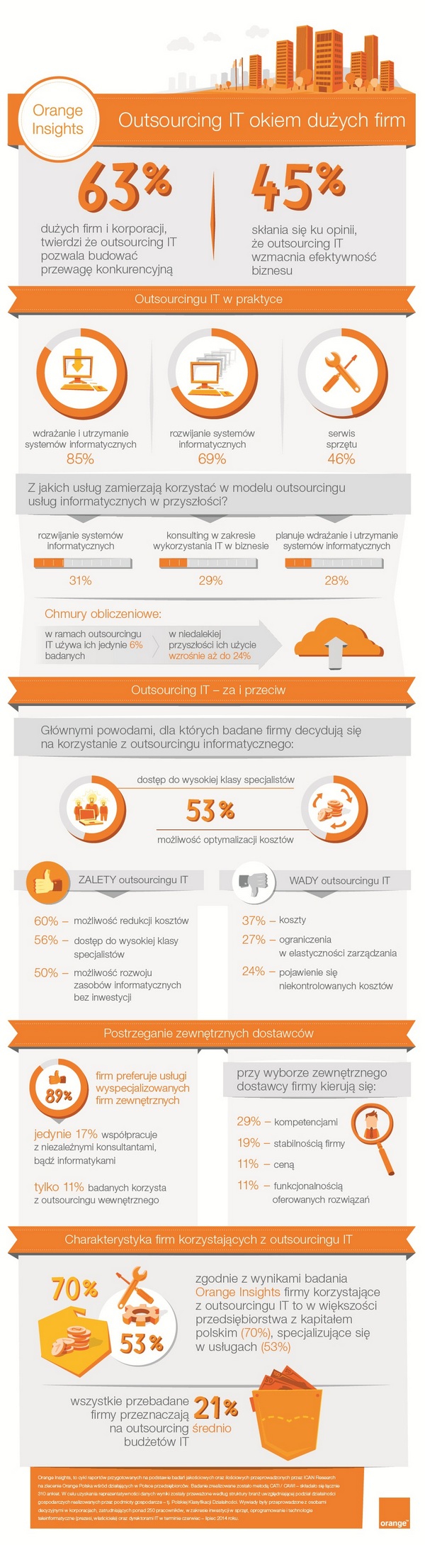 Orange Insights to cykl raportów przygotowanych na podstawie badań jakościowych oraz ilościowych przeprowadzonych przez ICAN Research na zlecenie Orange Polska wśród działających w Polsce przedsiębiorców. Badanie zrealizowane zostało metodą CATI / CAWI – składało się łącznie z 310 ankiet. W celu uzyskania reprezentatywności danych wyniki zostały przeważone według struktury branż uwzględniającej podział działalności gospodarczych realizowanych przez podmioty gospodarcze – tj. Polskiej Klasyfikacji Działalności. Wywiady były przeprowadzone z osobami decyzyjnymi w korporacjach, zatrudniających ponad 250 pracowników, w zakresie inwestycji w sprzęt, oprogramowanie i technologie teleinformatyczne (prezesi, właściciele) oraz dyrektorami IT – w terminie czerwiec – lipiec 2014 roku.