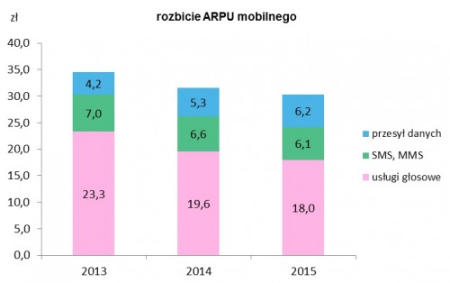 wynikał z ogromnego popytu na transmisję danych. Wzrost transmisji danych w sieciach mobilnych w przeliczeniu na klienta znacznie przekroczył 100%. Udział ARPU z przesyłu danych w całkowitym zagregowanym ARPU wzrósł z 17% w 2014 r. do 20% w 2015 r. Analizując spadek ARPU należy zauważyć że w roku 2015 był on znacząco niższy niż w poprzednim roku,