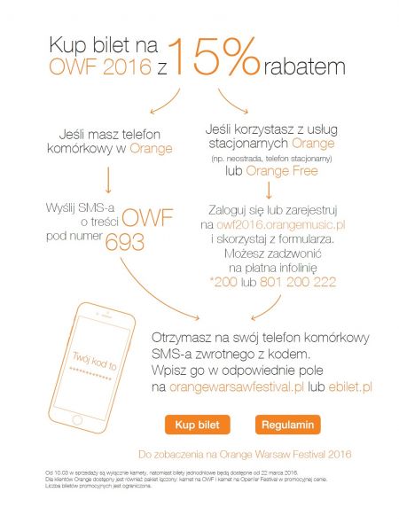 Właśnie ruszyła sprzedaż biletów na Orange Warsaw Festival 2016. Pospieszcie się, bo bilety kupione w najbliższym czasie są tańsze od ceny standardowej. Do tego Organizator ma zniżki dla klientów Orange oraz wspólny tańszy pakiet na dwa festiwale: Opener i OWF.
