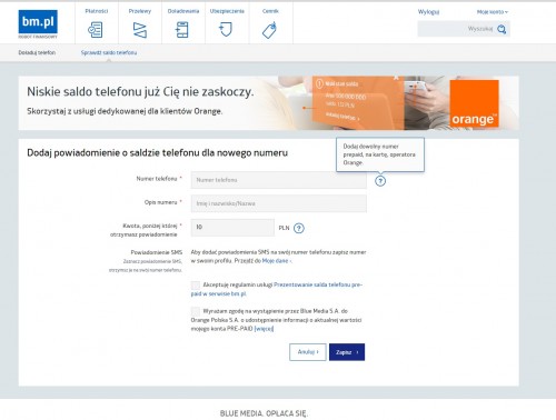 Udostępniona klientom operatora telefonii komórkowej Orange nowa funkcja w serwisie bm.pl pozwala zautomatyzować zarządzanie saldem konta prepaid. Klient, po zalogowaniu do serwisu, może dodać nawet 20 różnych numerów telefonów, którymi chce zarządzać. Może także samodzielnie ustalić kwotę w przedziale od 1 do 1000 zł, po przekroczeniu której system wygeneruje alert o braku środków na koncie. Domyślnie próg ustawiony jest na 10 zł. Oczywiście bm.pl pozwala też w łatwy sposób doładować wybrane konto.