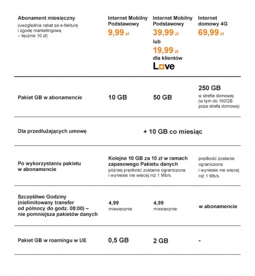 Nowością dla klientów jest pakiet usług Orange Love z Internetem Domowym 4G i telewizją za 99,99 zł miesięcznie. Dzięki niemu możemy swobodnie korzystać z internetu w domu i cieszyć się telewizją Orange TV z pakietem Optymalnym z 92 kanałami (w tym 41 HD) – również na terenach nieobjętych zasięgiem internetu stacjonarnego. W ramach pakietu otrzymujemy również abonament komórkowy z nielimitowanymi rozmowami do wszystkich sieci komórkowych i stacjonarnych, SMS-ami, MMS-ami w Polsce i w roamingu w UE oraz pakietem internetu 5 GB (w tym ponad 2 GB w UE). To wszystko w ramach jednej umowy i na jednej fakturze.