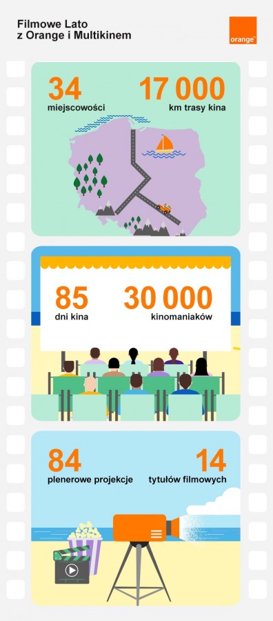 Bałtyk i Podhale, Mazury i Karkonosze, Kaszuby i Zamojszczyzna. Tego lata kinowa rozrywka z Orange i Multikinem dotarła do 34 miejscowości. Przez trzy miesiące, w całej Polsce trwał projekt Filmowe Lato z Orange i Multikinem. Bezpłatne kino plenerowe za nami. 85 dni projekcyjnych, prawie 30 tysięcy uczestników oraz 14 pokazanych tytułów filmowych – podsumowuje Filmowe Lato z Orange i Multikinem – pomarańczowy Operator.