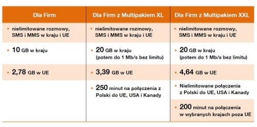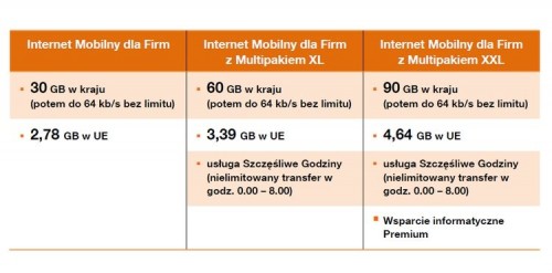 Takie same, proste zasady i ceny obowiązują w ofercie na Internet Mobilny dla Firm. Tu też mamy jeden plan podstawowy za 34,99 zł + VAT, a do niego dwa Multipaki – za 10 lub 30 zł +VAT. Także tutaj przedsiębiorcy mogą zamówić dodatkowe karty SIM z abonamentem zrabatowanym do 19,99 zł +VAT. Są oczywiście różnice, bo w końcu tutaj mamy do czynienia z usługa internetową – zakres usług w poszczególnych Multipakach, jak i planie podstawowym musi być inny: