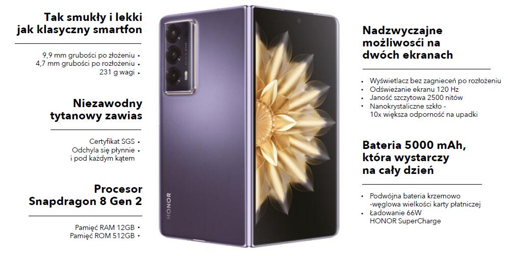W najbliższą niedzielę, w ofercie bez abonamentu, można kupić nowoczesny telefon HONOR Magic V2 5G 16/512 GB aż o 1000 zł taniej. W tej samej cenie ten składany smartfon będzie dostępny zarówno jako produkt solo, jak i w wygodnym zestawie z ładowarką. Kto pierwszy ten lepszy.