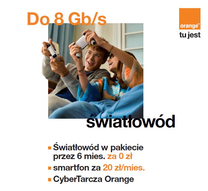 Nowi użytkownicy światłowodu, którzy zdecydują na jedną z wyższych prędkości (do 1 Gb/s, do 2 Gb/s, do 8 Gb/s) i podpiszą umowę na 24 mies. – otrzymają aż 6 miesięcy abonamentu za 0 złotych. Wybierając Orange Światłowód do 600 Mb/s, klienci dostaną 4 miesiące abonamentu za 0 zł. Oferta dotyczy światłowodu jako samodzielnej usługi oraz pakietów z abonamentem komórkowym, a także z telewizją (również z Netflixem). Kupując światłowód w pakiecie z abonamentem komórkowym można dobrać smartfon z superniską ratą: 20 zł/mies. (przy umowie na 36 mies.).