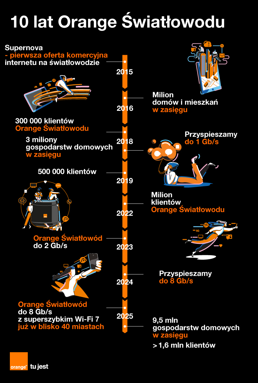 Mija 10 lat od kiedy Orange zaoferował pierwszą, komercyjną, ogólnopolską usługę internetu na światłowodzie podłączonym bezpośrednio do domu lub mieszkania. Był on dostępny w 16 miastach w kraju, a najwyższa opcja prędkości wynosiła 600 Mb/s. Dziś Orange Światłowód rozpędził się do 8 Gb/s, ma już ponad 1,6 mln klientów, dociera do 9,5 mln domów, mieszkań i firm w kraju, a jak potwierdzają niezależne pomiary prędkości internetu, jest najszybszym światłowodem w Polsce.