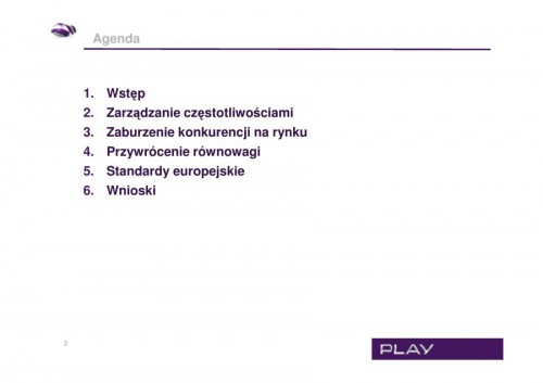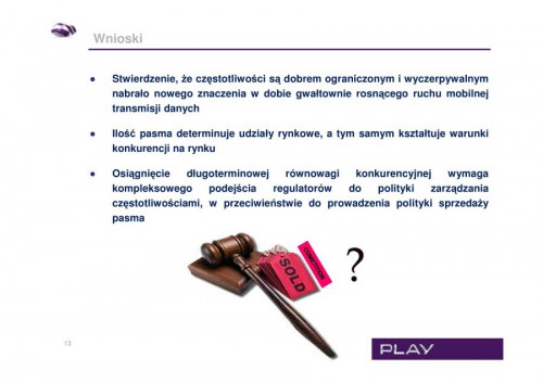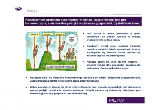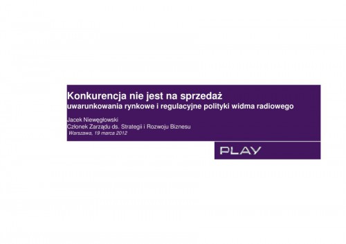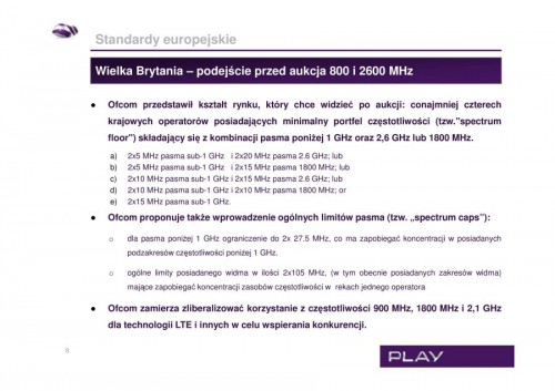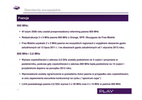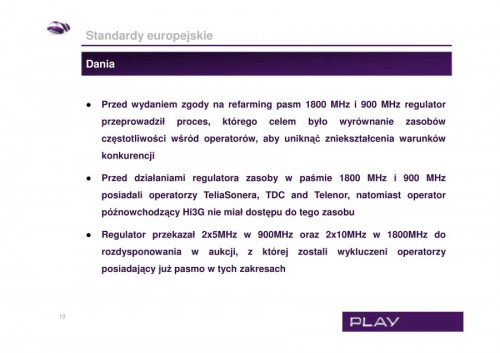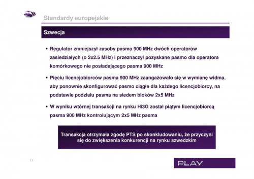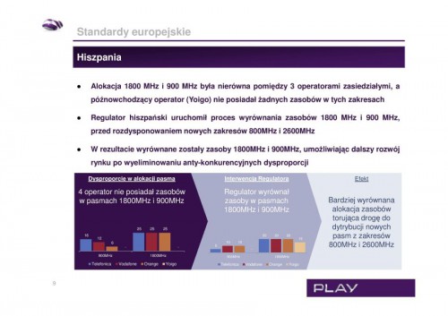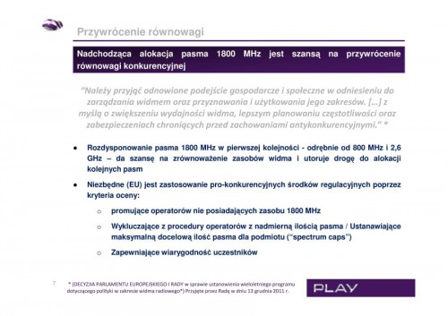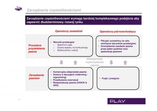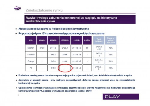 Marcin Gruszka, rzecznik Play, na swoim blogu udostępnił prezentację Jacka Niewęgłowskiego, członek zarządu P4 ds. strategii, w której odnosi się on do uwalnianych właśnie częstotliwości z zakresu 1800 MHz. Sprawnie działający rynek i zdrowa konkurencja między dostawcami usług telekomunikacyjnych, to dobro samo w sobie, podlegające ochronie prawnej. Dobro którego nikt nie wystawia na aukcję – mowi Jacek Niewęgłowski.