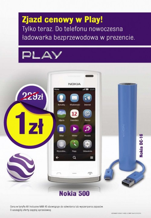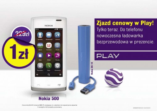 Play: Nokia 500 z ładowarką <---- rozśmieszył mnei slogan. A ta ładowarka działa na zasadzie pewnie baterii.