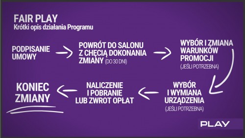 W ramach programu FAIR PLAY, Klienci mają prawo wymienić urządzenie, które zakupili wraz z podpisaniem umowy. Mogą też je zwrócić, jeśli decydują się na rezygnację z umowy. W każdym z tych przypadków, gdy Klient zwraca wcześniej zakupione urządzenie, jest on zobowiązany do uiszczenia Opłaty za Korzystanie z Urządzenia. Bez względu na to, czy urządzenie jest rozpakowane, czy nie, opłaty są jednakowe i uzależnione jedynie od grupy, w której się ono znajduje. Wysokość opłat waha się od kwoty 49 zł do 399 zł z VAT, a szczegółowa lista urządzeń z przypisaną do niej wysokością opłaty znajduje się w Cenniku Telefonów, Modemów i Zestawów bez Promocji, dostępnym w salonie Play lub na www.play.pl. Sprzedawca Play będzie mógł odmówić przyjęcia zwracanego sprzętu, jeśli będzie on niesprawny, uszkodzony przez niewłaściwe użytkowanie lub zestaw, który oddaje jest niepełny.