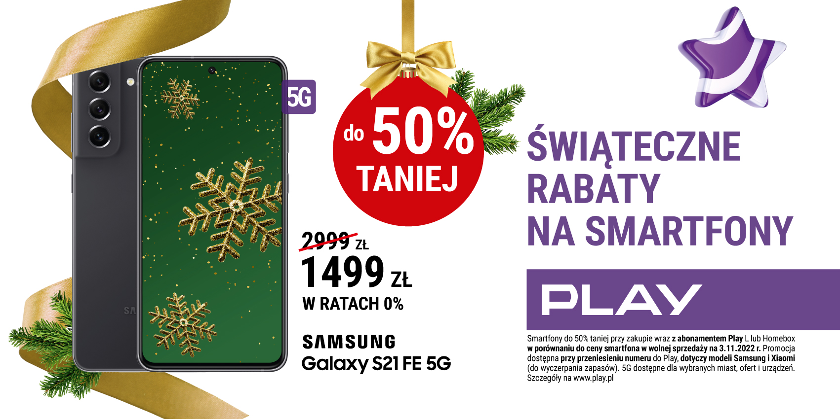 Od 4 listopada wszystkie osoby przenoszące swój numer do Play do ofert abonamentowych M, L lub Homebox mogą skorzystać ze świątecznej promocji! Wybierając smartfon Samsung lub Xiaomi można otrzymać na niego nawet 50% rabatu, a opłatę rozłożyć na wygodne raty 0%. To świetna okazja, aby sprawić prezent bliskim lub wymienić telefony w firmie.