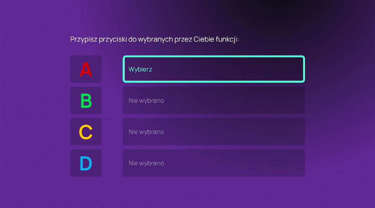 Przyciski ABCD na pilocie zyskały nowe funkcje – teraz możesz przypisać do nich swoje ulubione kanały lub aplikacje. Przejście do nich wymaga tylko jednego kliknięcia. Konfiguracja skrótów jest prosta i dostępna w sekcji Konto → Pilot.