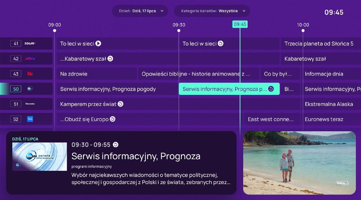 Program TV stał się bardziej przejrzysty – na jednej stronie wyświetlanych jest mniej kanałów i programów, co ułatwia znalezienie tego, co chcesz obejrzeć. Dodatkowo, znaczniki czasowe pojawiają się co 30 minut, a ciemniejsze, statyczne tło zwiększa komfort oglądania – zwłaszcza wieczorem.