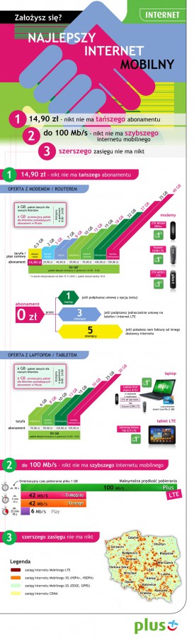 Najszybszy Internet mobilny LTE, o prędkości do 100 Mb/s, dostępny w najniższym abonamencie na rynku – już za 14,90 zł miesięcznie. Plus przygotował specjalną infografikę, porównującą własną ofertę internetową z ofertą konkurencji.