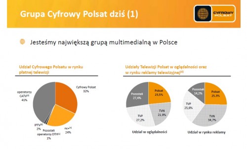 - Udział kanałów Grupy Telewizji Polsat w oglądalności wyniósł w III kw. br. 23,67% (z uwzględnieniem oglądalności kanałów TV4 i TV6 za pełny kwartał);