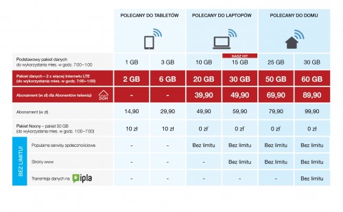 Największy pakiet dla klientów Internetu LTE zawiera teraz aż 60 GB, dodatkowe 50 GB danych do wykorzystania w nocy (od 1.00 do 7.00) i pozwala na nielimitowane przeglądanie zwykłych stron WWW i serwisów społecznościowych. W ramach pakietu użytkownik bez limitu skorzysta także z największej telewizji internetowej IPLA.