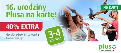 We worek 3 czerwca najstarsza oferta pre-piad w Polsce kończy 16 lat. Z tej okazji Plus na Kartę świętuje razem ze swoimi klientami i każdy, kto w dniach 3-4 czerwca „doładuje się” przez konto bankowe za 20-99 zł otrzyma premię aż 40% extra wartości doładowania.