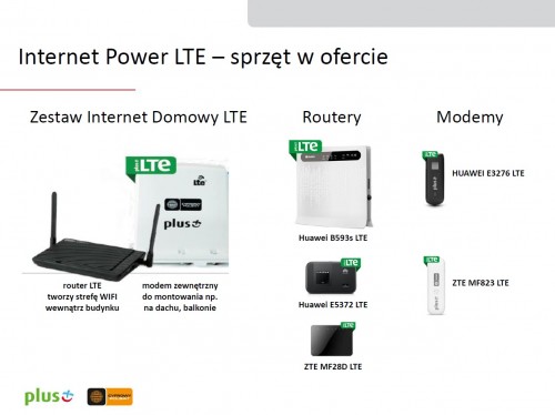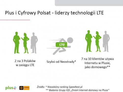 LTE Plusa i Cyfrowego Polsatu to największa i najnowocześniejsza sieć tej technologii w Polsce, która swoim zasięgiem obejmuje 2 na 3 mieszkańców kraju, czyli aż 26 mln Polaków. Oferowana przez Plus i Cyfrowy Polsat technologia LTE, jako jedyna w Polsce umożliwia pobieranie danych z prędkością aż do 150 Mb/s. LTE w Plusie i Cyfrowym Polsacie pozwala na komfortowe i superszybkie korzystanie z Internetu: pobieranie dużych plików, dzielenie się nimi, bezproblemowe korzystanie z aplikacji, gier, chatów, komfortowe oglądanie filmów, bez buforowania i zakłóceń.