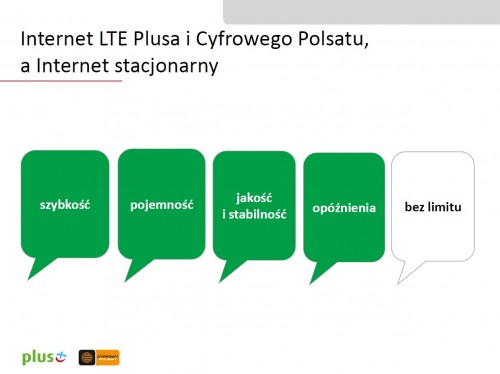 Parametry techniczne Internetu LTE sprawiają, że zaczyna on powoli stawać się doskonałą alternatywą dla łącza stałego. Natomiast jego przewagą jest mobilność. Jesteśmy przekonani, że tak jak telefony komórkowe zastąpiły linie stacjonarne, tak w dłuższej perspektywie, wraz z rosnącą popularnością smartfonów i rozwojem infrastruktury LTE, klienci dostrzegą bezzasadność posiadania dwóch usług – stacjonarnej i mobilnej – oraz płacenia dwóch abonamentów i wybiorą tę bardziej uniwersalną, czyli mobilną – mówi Dominik Libicki, Prezes Zarządu Cyfrowego Polsatu i Członek Zarządu Polkomtelu.