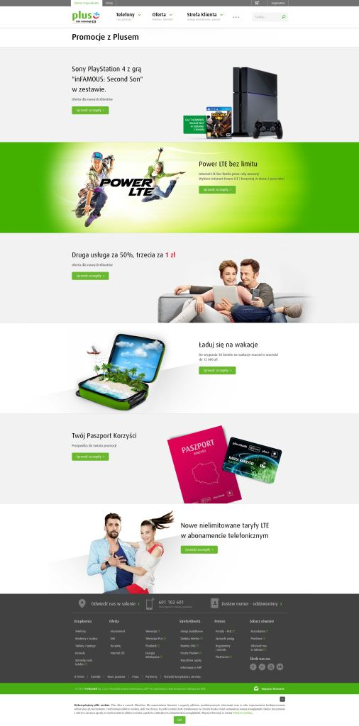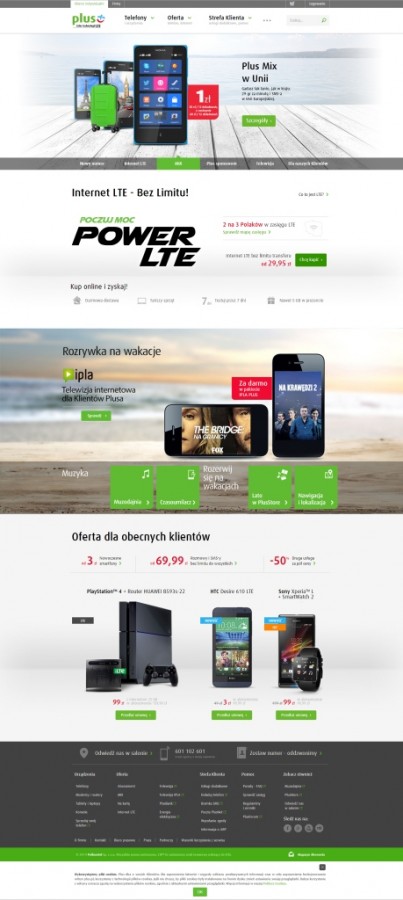 Nowy portal www.plus.pl został w całości zaprojektowany zgodnie z wytycznymi RWD (Responsive Web Design). Wygląd, funkcjonalności i układ poszczególnych stron dostosowują się automatycznie do rozmiaru ekranu urządzenia, z którego aktualnie korzysta użytkownik. Stworzone w tej technice strony są uniwersalne i czytelnie prezentują swoją zawartość zarówno na ekranie komputerów, jak i ekranach tabletów czy smartfonów.