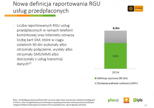 W poniższej prezentacji przedstawiony został nowy układ wskaźników operacyjnych (KPI) obejmujących naszą działalność w obszarach telekomunikacji i płatnej telewizji. Prezentowane wskaźniki operacyjne sprzed tego okresu mają jedynie charakter informacyjny oraz przedstawiają, jaki wpływ na wyniki operacyjne Grupy miałyby wyniki operacyjne grupy Metelem, a w szczególności Polkomtelu, gdyby wchodziła ona w skład Grupy Polsat w porównywanych okresach. Wskaźniki te zostały przygotowane wyłącznie w celach ilustracyjnych i ze względu na swój charakter prezentują hipotetyczną sytuację, dlatego też nie przedstawiają rzeczywistych wyników operacyjnych Grupy za dane okresy.