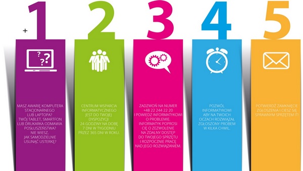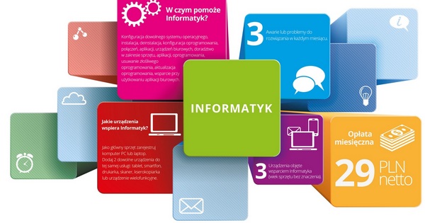 Usługa Informatyk została stworzona z myślą o małych i średnich firmach i pomoże rozwiązać każdy problem z komputerem. Zapewnia ona kontakt z wykwalifikowanym zespołem informatyków i obejmuje wsparcie klientów w zakresie takich zagadnień jak na przykład konfiguracja urządzeń typu PC, laptop, tablet, smartfon, rozwiązywanie problemów nieprawidłowego działania sprzętu komputerowego i podłączonych urządzeń typu urządzenie wielofunkcyjne, drukarka, monitor, myszka oraz wsparcie dla obsługi aplikacji biurowych.