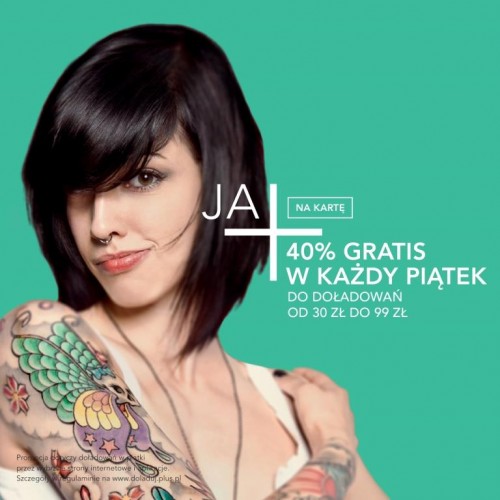Dodatkowe 40% wartości doładowania można otrzymać tylko w piątki po zasileniu swojego konta za pomocą kanału bankowo-internetowego. Promocja dotyczy klientów usług „na kartę”: JA+ Na Kartę, Internet Na Kartę, Plus Internet Na Kartę, którzy muszą dokonać zasilenia w wysokości 30-99 zł. Dla klientów ofert JA+ Mix, Plus Mix oraz Plush Mix bonus promocyjny naliczany jest tylko przy doładowaniu nominałem 10 i 20 zł.