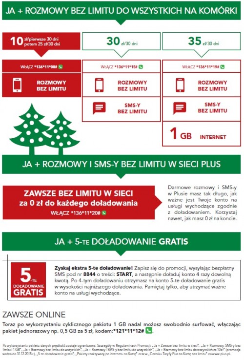 Od 3 listopada startuje, przygotowana specjalnie na Gwiazdkę promocja „Ja + Rozmowy bez limitu do wszystkich za 10 zł”, dzięki której klienci taryf „Plus na Kartę bez limitu” mogą przez 30 dni w obniżonej cenie wykonywać nielimitowane polaczenia do wszystkich sieci komórkowych.