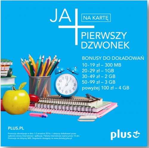Promocja „Pierwszy dzwonek” jest dostępna dla klientów wszystkich usług „na kartę” w sieci Plus: JA+ Na Kartę, Plus na Kartę, Plush na Kartę, Simplus, Sami Swoi, 36,6, JA+ Internet Na Kartę, Plus Internet Na Kartę. Musza oni jedynie dokonać zasilenia swojego konta za pomocą kanału bankowo-internetowego kwotą w wysokości 50-99 zł.