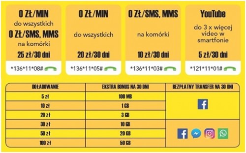 1. Oferta za 25 zł na 30 dni: pakiet internetowy 10 GB, rozmowy bez limitu do wszystkich sieci komórkowych i na numery stacjonarne, SMS-y i MMSy bez limitu do wszystkich sieci komórkowych, zestaw social media (Facebook, Messenger, Instagram, WhatsApp) z bezpłatnym transferem danych.