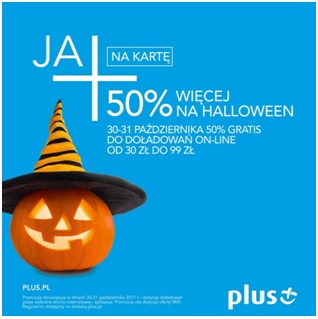 Tylko przez dwa dni – 30 i 31 października br. – użytkownicy usług na kartę w Plusie i Plushu mogą skorzystać z wyjątkowej promocji na Halloween! Każdy, kto w tym terminie doładuje za pośrednictwem kanału internetowo-bankowego swoje konto kwotą od 30 zł do 99 zł, otrzyma 50% GRATIS do wartości doładowania.