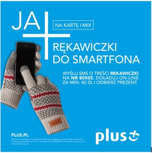 Rękawiczki do smartfona to kolejny prezent Plusa dla użytkowników usług na kartę oraz mix. Z nowej promocji można korzystać już od dziś, wystarczy tylko wysyłać na numer 80505 bezpłatnego SMS-a o treści REKAWICZKI, a następnie za pośrednictwem kanału internetowo-bankowego doładować swoje konto za minimum 40 zł.