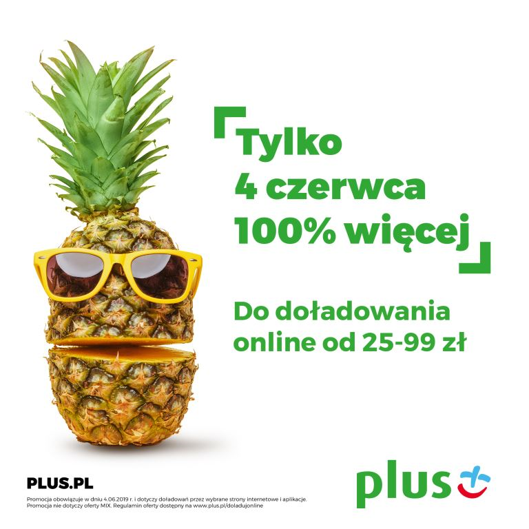Bonus 100% więcej do doładowania mogą dostać użytkownicy ofert „na kartę” sieci Plus w jednodniowej promocji, która obowiązuje tylko we wtorek 4 czerwca. By z niej skorzystać wystarczy za pośrednictwem kanału bankowo-internetowego doładować swoje konto kwotą od 25 zł do 99 zł.