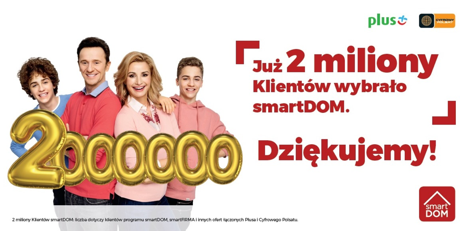 Dwa miliony użytkowników Programu smartDOM to okazja do świętowania oraz podziękowań za zaufanie, jakim klienci obdarzyli Plusa i Cyfrowy Polsat. Specjalnie uhonorowany zostanie dwumilionowy klient smartDOM, dla którego przygotowane zostały wyjątkowe nagrody rzeczowe oraz roczny dostęp do pakietu usług. Liczne prezenty i niespodzianki czekają na wszystkich klientów smartDOM i będą o nich informowani SMS-ami przez cały najbliższy miesiąc. Zaplanowano wyjątkowy wieczór w Centrum Nauki Kopernik, które będzie otwarte tylko dla klientów smartDOM i będą oni mogli bezpłatnie zwiedzić wystawę „Zmierz się”, galerię „Re;generacja” oraz „Strefę eksperymentowania”. W lutowe środy wysłane będą instrukcje, jak otrzymać w prezencie miesięczne kody dostępu do pakietów: IPLA Premium, IPLA Polsat Sport Premium, IPLA Sport, IPLA HBO. Również w lutym rozdanych zostanie 650 biletów na mecze siatkarskiej PlusLigi i Ligi Siatkówki Kobiet. Planowane są również specjalne zamknięte pokazy kinowe filmów.